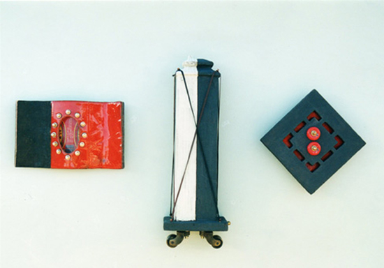 clay, glazes, metal, found materials; 850 x 400 x 80mm; Red; Masterworks Gallery, Auckland; 2000 Artists statement - Click here to view